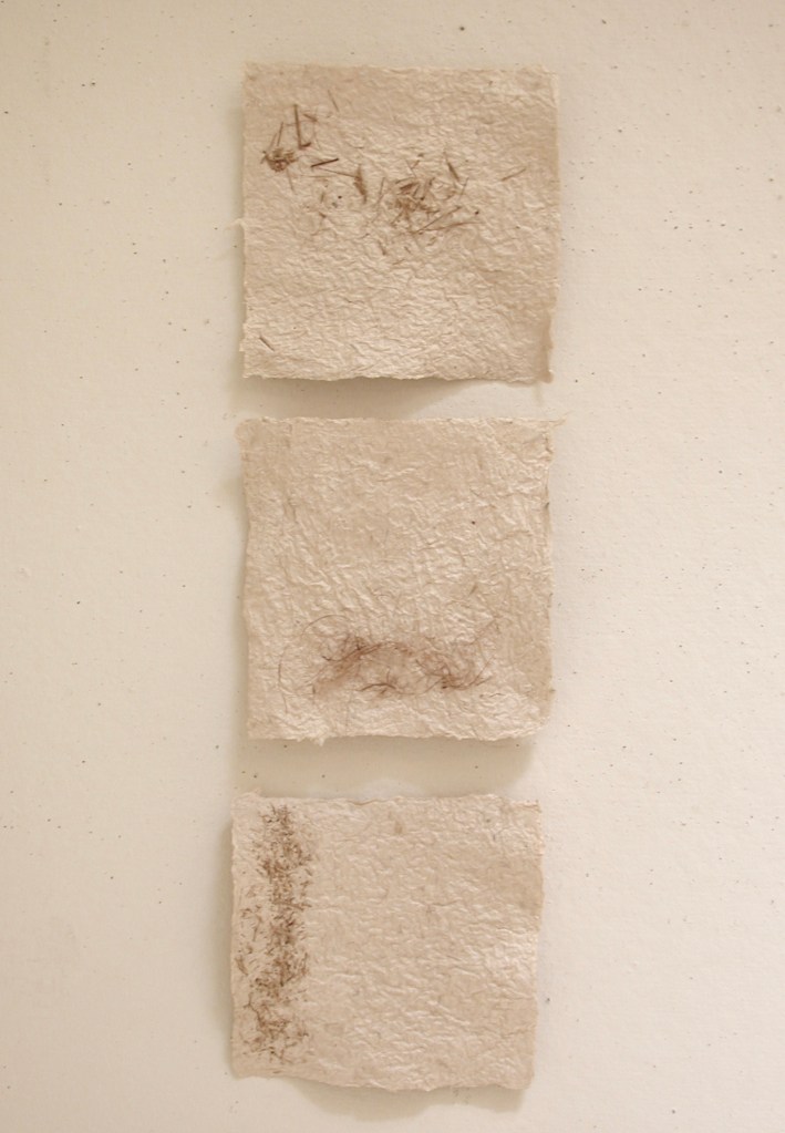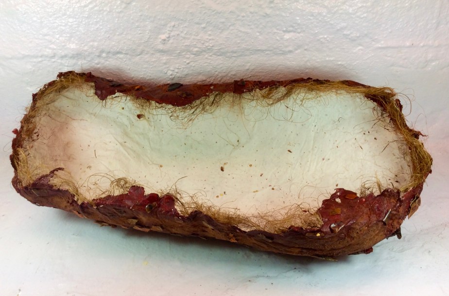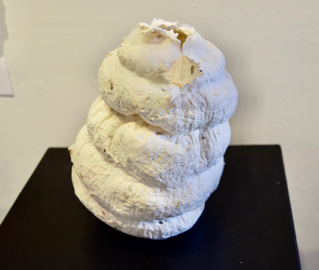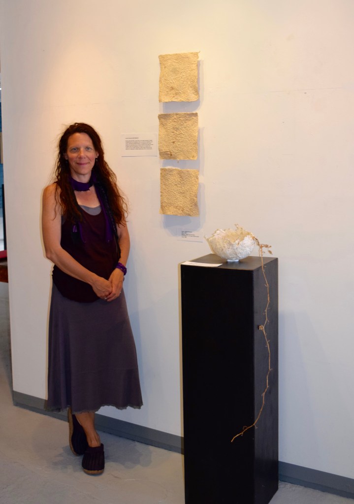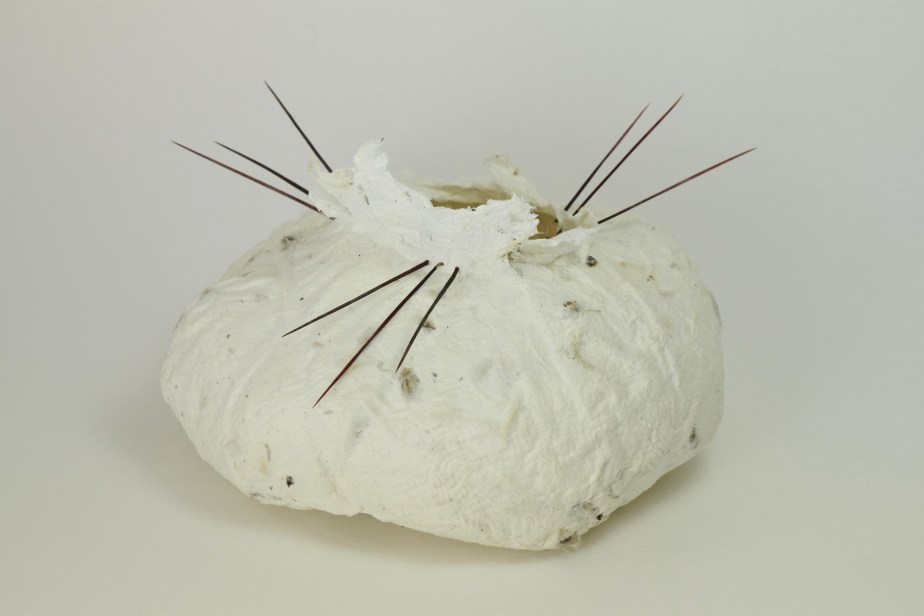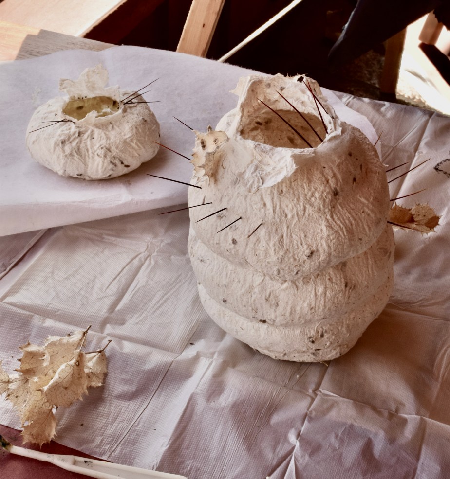 Every new environment inspires my creativity and has an effect on my work. I draw from the vegetation and land for my paper pulp and dyeing process: the shapes and lines of the natural surroundings for my forms and mark-making. I enjoy the alchemic fusion of sun, earth, air and water into organic forms. I moodle about the landscape gathering from the earth; a withered plant fiber from the desert willow, an old sycamore seed pod, cactus needles, and clay from the earth. These gifts become the pulp from which I create. Forms and vessels which speak to me: mirrors of my inner landscape offering a sense of belonging to my body, my body as this earth.
